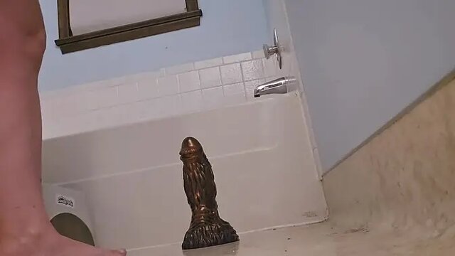 A sultry mature woman with big sex toy rides an alien dildo in her tight anal. She squats and bounces on the large sex toy, moaning loudly. The mature woman gets deep into her anal adventure with the alien dildo.