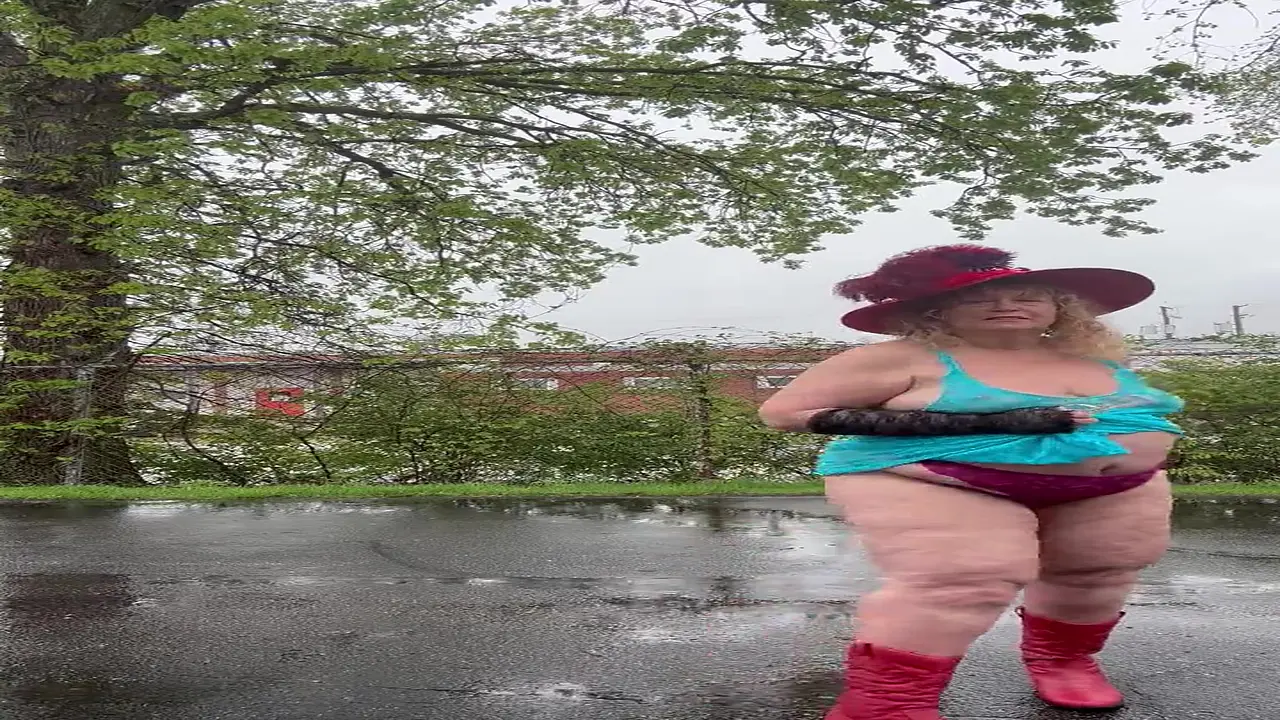 A mature and slutty granny in hot lingerie plays with her big, curvy boobs and nipples. Her big ass sways as she catches raindrops on her ample cleavage. She's a true MILF in her prime, enjoying her sexy self.