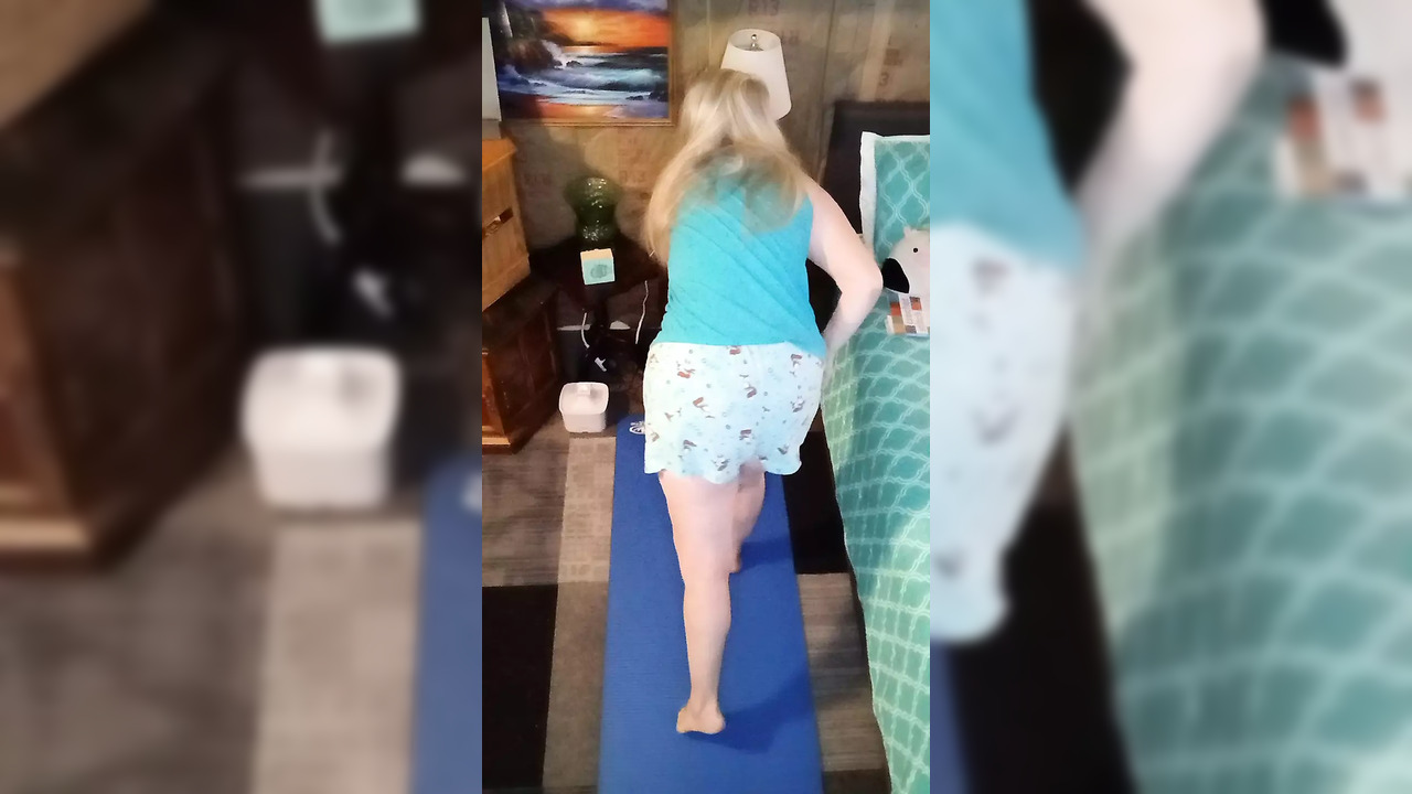 Vee, the sexy mature MILF with a perfect ass, performs naked yoga on her balcony. Her huge natural tits bounce as she stretches, giving a tantalizing view. She shows off her perfect boobs and teasingly plays with her pussie for the lucky camera man.